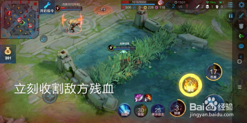 6.如图所示,典韦三技术的用处四:立即收割敌方残血。典韦开启三技术,直接跳斩到残血英雄的头上,是可能直接一下击杀残血英雄的,因为跳斩上去砍一下,敌方英雄就可能会被砍去1格血量摆布,所以残血英雄在典韦面前想逃都很难。