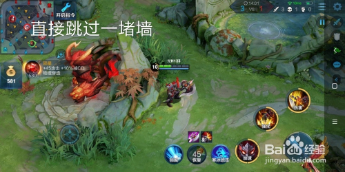 7.如图所示,典韦三技术的用处五:直接跳过一堵墙。典韦开启三技术,可以操纵图中的大红野怪,直接越过大红野怪四周的墙,直接砍到这个野怪头上,同时墙另一面是敌方英雄时,也可以操纵敌方英雄越过这个墙,直接砍到敌方英雄头上。