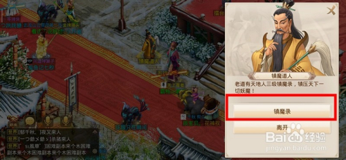 新增的镇魔道人是在天墉城擂台五行生效大使旁边,我们点击镇魔录。