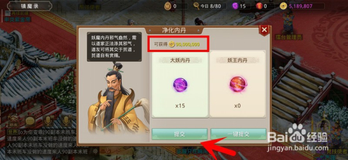 当您有了妖丹,点击镇魔道人,我要净化妖魔内丹,提交后即可获得大量游戏币,如下图所示。