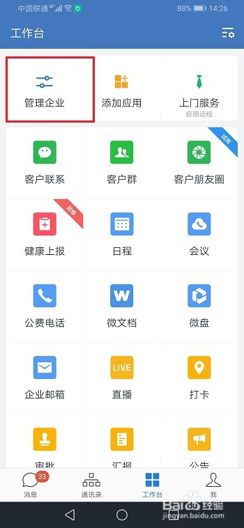 第一步手机上打开企业微信,进去工作台,点击办理企业,如下图所示: