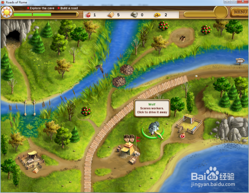 建造左下方的锯木厂,再修复中心的池沼地,当图中呈现狼时,操纵鼠标将其赶走。