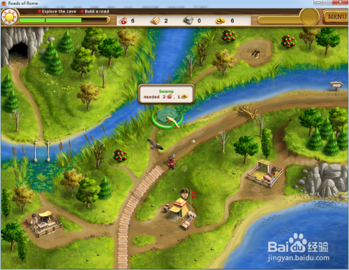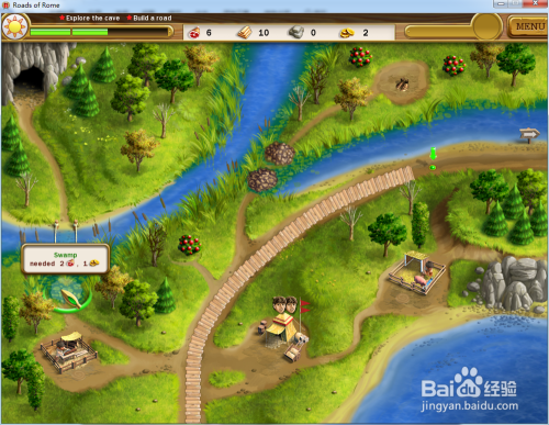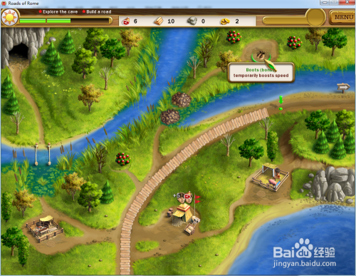 拾取右上方的飞鞋,它可以增添工人的移动速度,然后修复左面的池沼地及吊桥。