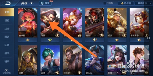 4.如图所示,在这个英雄界面中,我们点击箭头所指的“曹操”这个英雄。