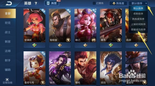 5、点击默认排序,点击选择荣耀战力排序。
