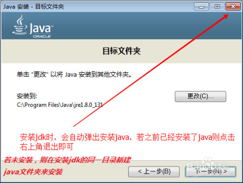 提醒:安装jdk会主动安装java,所以不需要本身零丁安装java,所以在安装jdk进行到安装java的那一步可以点击右上角的封闭退出java的安装,以打消公共jre的安装