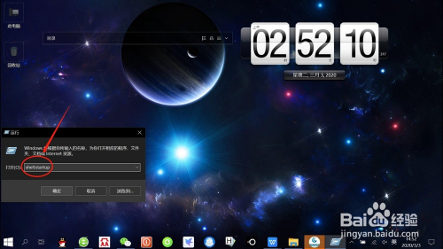 在“运行对话框”中,输入“shell:startup”号令,如下图所示。