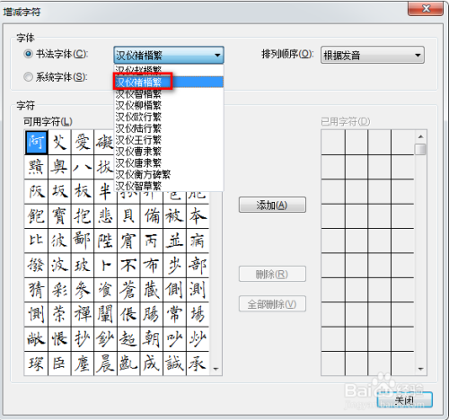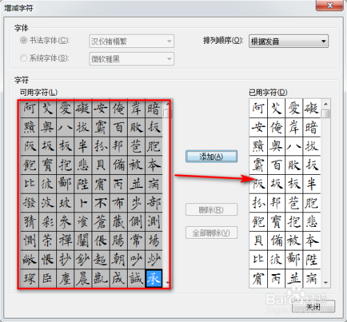 然后将设置框界面中呈现的字体部门选中,接着点击“添加”按钮,最后点击“封闭”,具体如下图所示:
