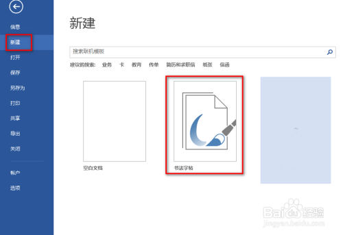 接着在呈现的界面中,点击“新建”,然后在右侧呈现的多个选项中,点击“书法字帖”,具体如下图所示: