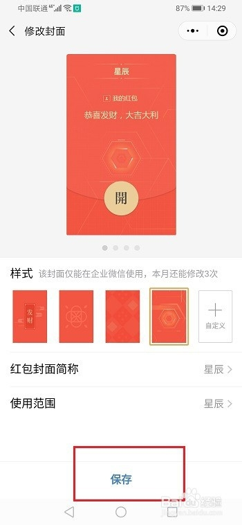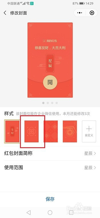 第四步进去红包封面设置界面,可以选择本身喜好的红包封面,也可以自界说,如下图所示: