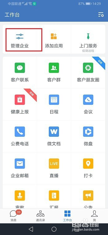 第一步手机上打开企业微信,进去工作台,点击办理企业,如下图所示: