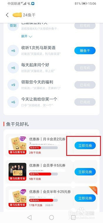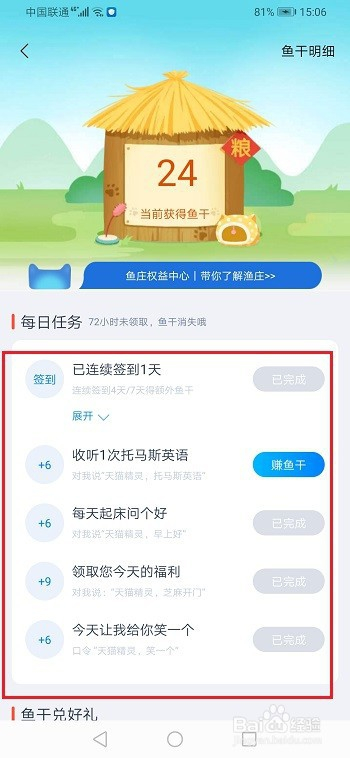 第一步我们首先需要知道天猫精灵的鱼干半斤八两于一种积分,可以用来兑换物品和优惠券,如下图所示: