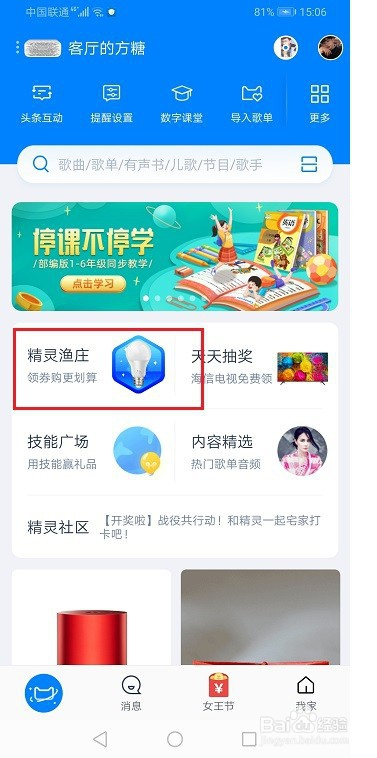 第二步下面我们来利用一下鱼干,进去天猫精灵首页,点击精灵渔庄,如下图所示: