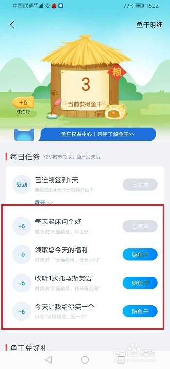 第二步进去精灵渔庄之后,可以经由过程签到和做使命来赚鱼干,如下图所示: