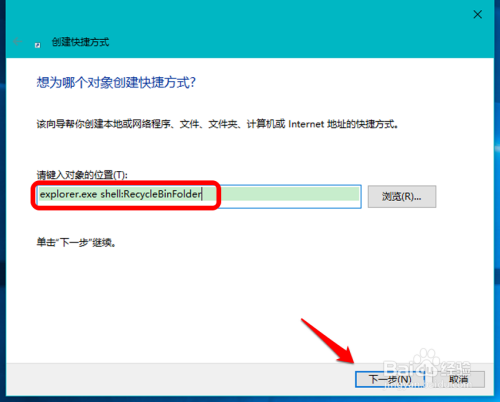 在 建立快捷体例 -【请键入对象的位置】中输入以下内容:explorer.exe shell:RecycleBinFolder ,点击:下一步;