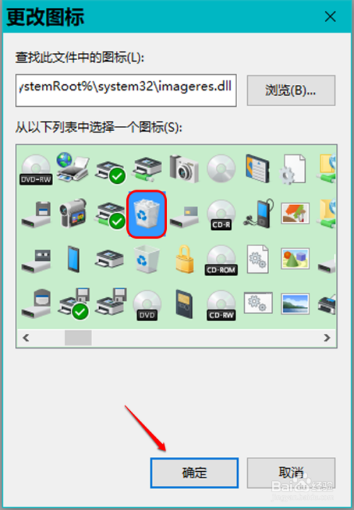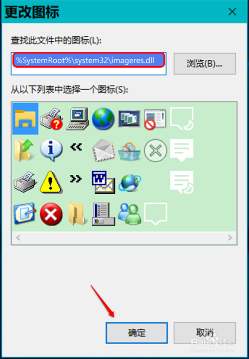 我们在查找此文件中的图标(L)下的小长框中输入:%SystemRoot%\system32\imageres.dll,再点击:确定,加载 imageres.dll 动态链接库文件;