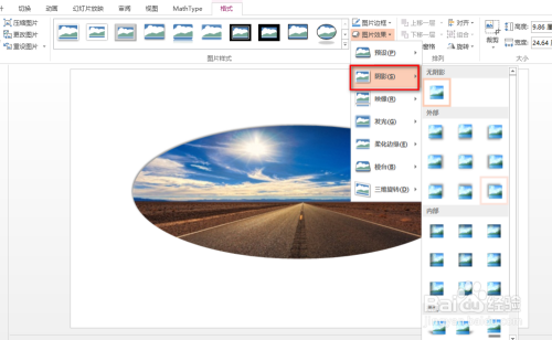 进一步,在“格局”选项卡下找到并点击“图片结果”下的小三角,在呈现的下拉菜单中,点击“暗影”,在呈现的多个样式示例中,点击一种样式,具体如下图所示: