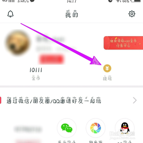 然后点击小我中间提现。