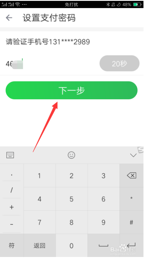 进入设置支付密码界面后,输入手机号验证码并点击“下一步”。