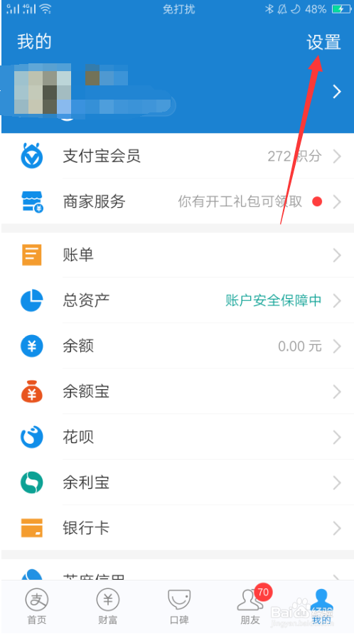 在手机上打开支付宝后,在我的界面点击“设置”。
