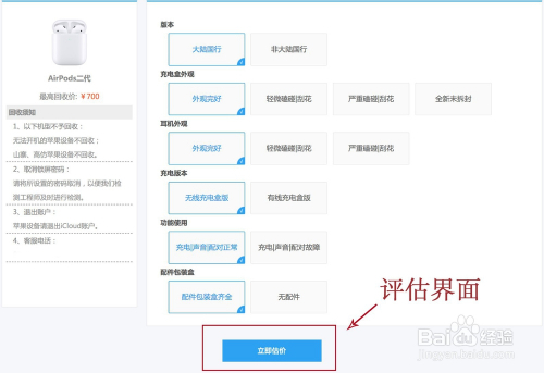 2.评估估价。平台关于AirPods需要勾选版本、充电盒外不雅、耳机外不雅、充电版本、功能利用等环境来评估,如实勾选完后点击当即估价