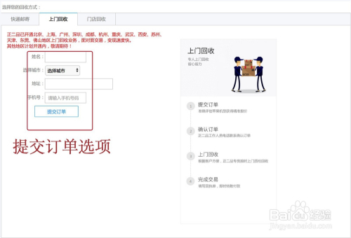 4.选择收受接管体例。可以选择上门收受接管、也可以选择邮寄收受接管以及门店收受接管,按照本身的需要进行选择,笔者选择上门收受接管,提交下单后,会收到平台的下单当作功提醒,提醒本身注重事项。