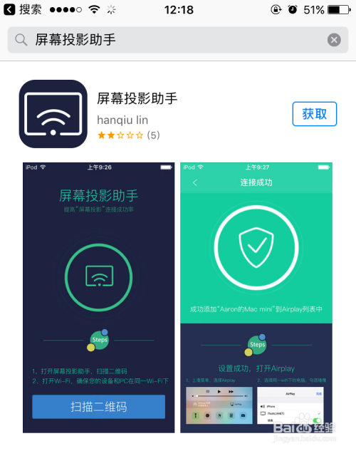 在手机端APP Store中找到“屏幕投影助手”,点击【获取】