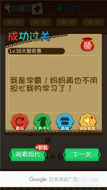 最强的大脑和其它烧脑闯关游戏一样,想要玩第35关需要打通之前所有的关卡,通关后可以无限玩了:点击返回选项回到关卡列表,然后选择第35关。
