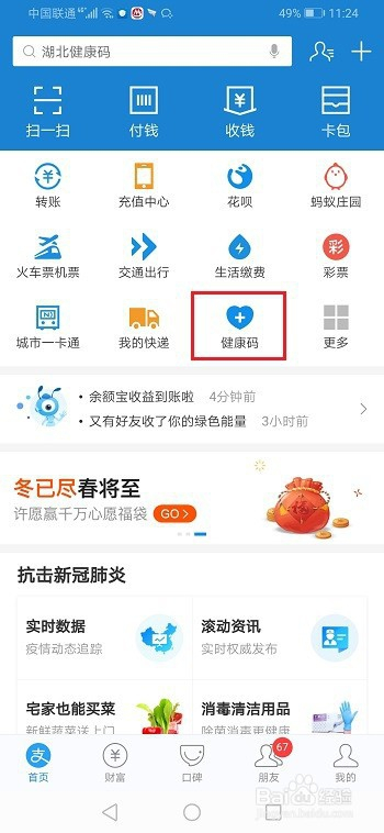 第一步手机上打开支付宝,进去首页,点击健康码,如下图所示: