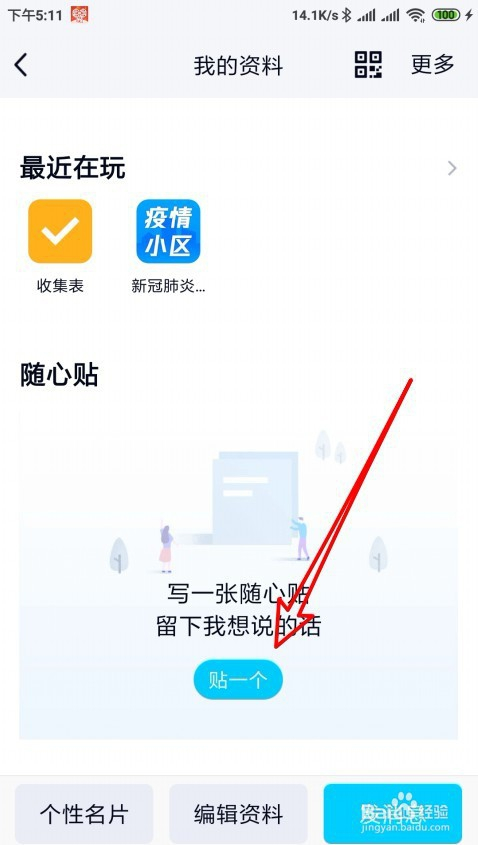 在打开的小我中间页面,点击贴一个的图标。