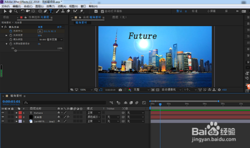 接下来会看到纯色层上的光晕结果,可恰当调整光晕的位置,并k关头帧,发生光晕活动结果。光晕亮度、镜头类型都可以调整。