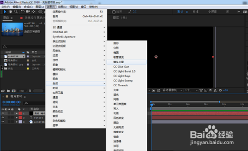 选中黑色纯色层,找到“结果”--“生当作”--“镜头光晕”,也可以在右侧结果面板直接搜刮该结果。