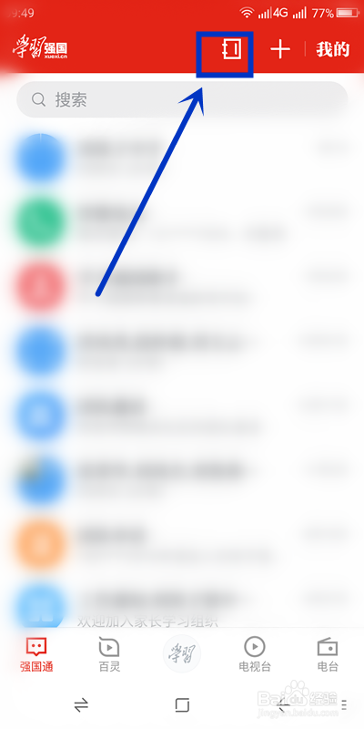 3、进入【强国通】页面后,最上一行找到并单击【通信录】选项