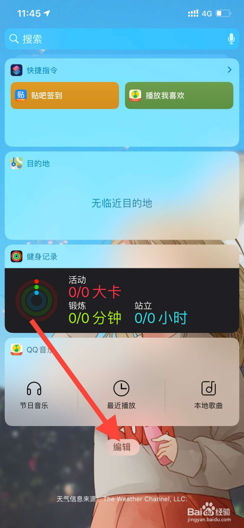 手机桌面拖到最左边一页,点击下面的编纂按钮。