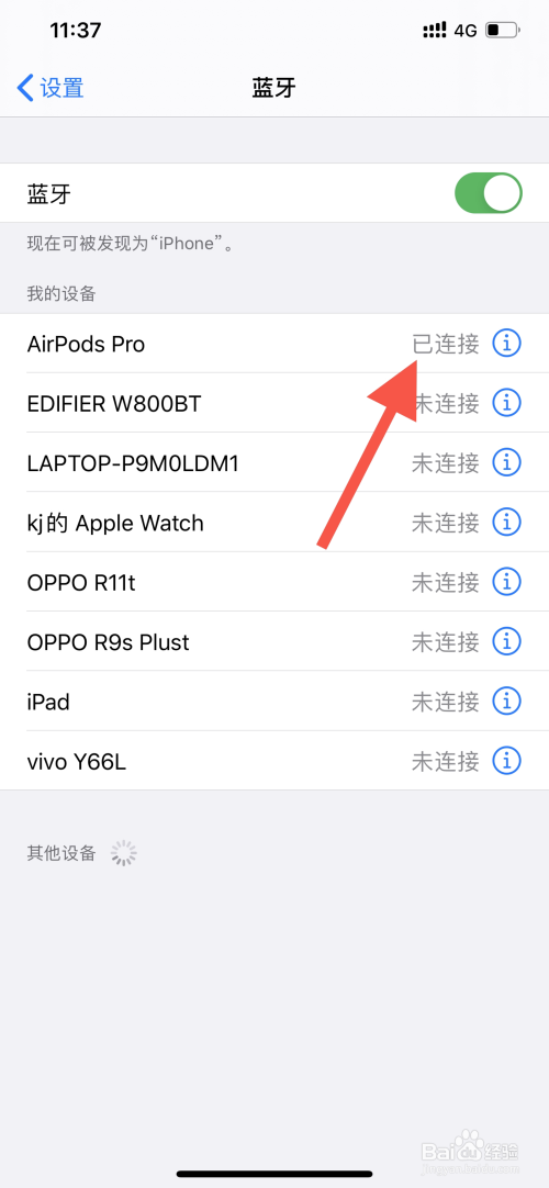 打开手机设置,点击蓝牙,找到已经毗连的airpods pro,点击右边的蓝色按钮。