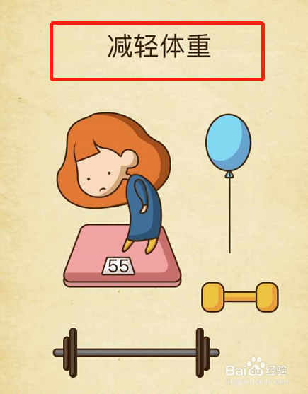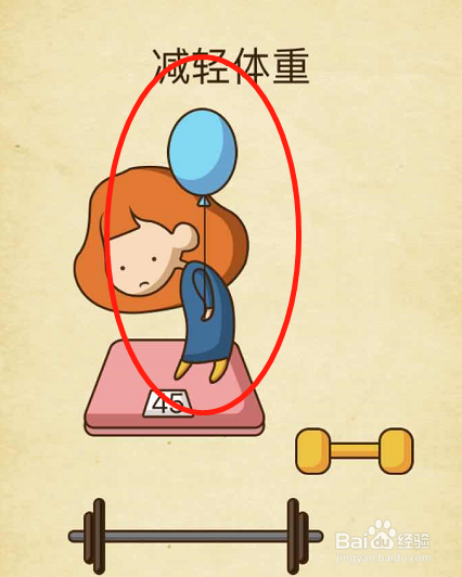 这一关的准确做法并不是用旁边的健身器材,而是要将旁边的气球移动到小女孩的手上,当小女孩拿着气球之后,气球会将小女孩提起来,这样体重秤上面的数字就会变轻了。