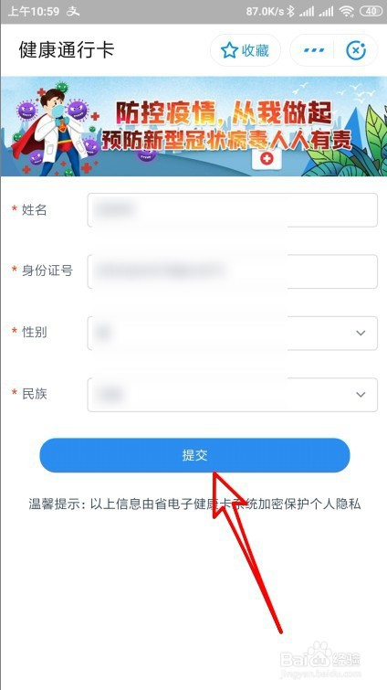 然后在打开的健康通行卡页面输入响应的信息后,点击提交按钮。