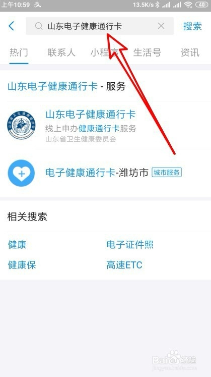 接下来在打开的搜索框中输入山东电子健康通行卡的关头词进行搜刮。