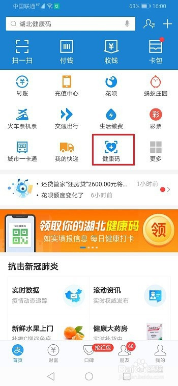 第一步手机上打开支付宝,进去首页之后,点击健康码,如下图所示: