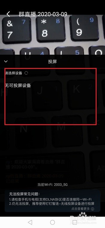 第五步让手机和电视毗连在统一个wifi,搜刮投屏设备,进行投屏,就可以将直播视频投屏到电视上了,如下图所示: