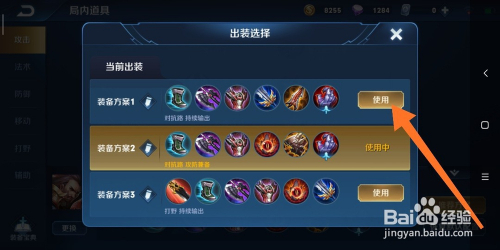 8.如图所示,在弹出的“出装选择”的面板中,有3种出装备的方案,我们点击箭头所指的“利用”按钮,就可以利用这套出装方案了,因为这个出装备的方案,是最适合上路曹操利用的出装备方案了。