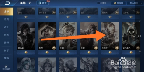 4.如图所示,在进入这个英雄界面中,我们将页面往上拉,直到找到“孙悟空”这个英雄为止。