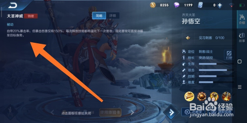 8.如图所示,弹出的面板中的内容,就是孙悟空这个英雄,被动技术的弄法申明了。