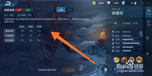 14.如图所示,弹出的面板中的内容,就是孙悟空这个英雄,三技术的弄法申明了。此刻我们都领会完孙悟空,这个英雄的所有技术弄法了,那我们从速去开一把游戏,去玩玩孙悟空这个英雄吧!