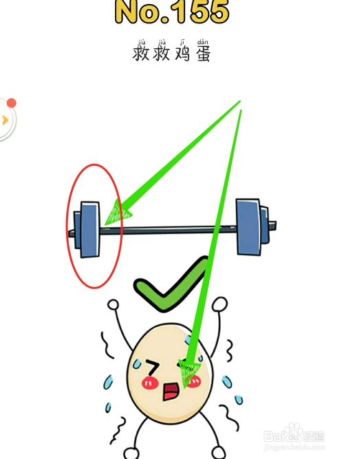 5.最后我们用手指按住杠铃,鸡蛋不碎即可过关。