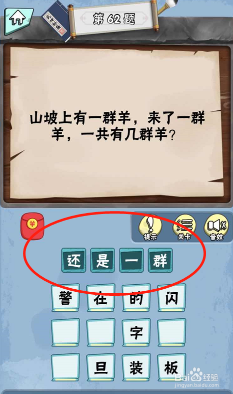 在脑子急转弯达人Lv4科学怪人第62关内,山坡上面有一群羊,然后又来了一群羊,提问我们此刻山上一共有几群羊。