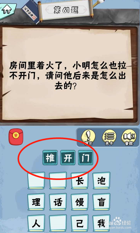 在脑子急转弯达人Lv4科学怪人第61关内,房间着火了,小明怎么拉也拉不开门,可是后来小明仍是逃出去了,提问我们小明是怎么出去的。