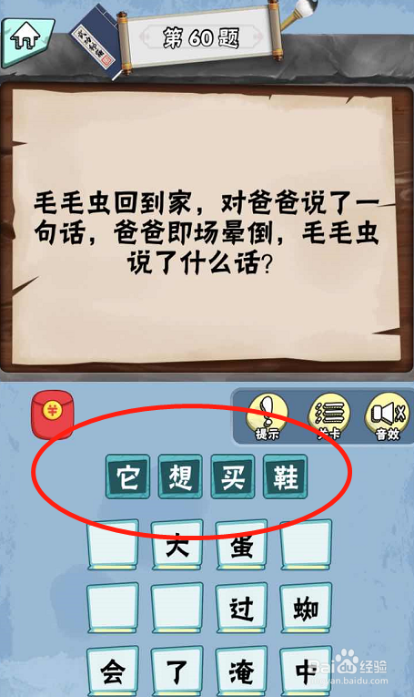 在脑子急转弯达人Lv4科学怪人第60关内,毛毛虫回抵家之后,对爸爸说了一句话之后,爸爸就地就晕倒了,提问我们毛毛虫到底说了什么。