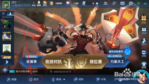 第一步:打开游戏本家儿界面,右下方找到铭文选项,如图