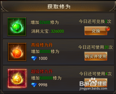 此时,就可以看到三种体例进行获取“修为”,点击后方兑换或利用就行了